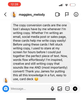 ❝If you’re having trouble communicating the value of your products and services, you may be spending more time feeling frustrated than feeling fulfilled with the impact you are creating for your clients. The copy and messaging strategies James teaches have helped me to strengthen the message that I share with my clients and future clients so much over the past few years that now I feel confident (seriously!) whenever I open a blank document to start drafting email or ad copy. It’s amazing to know that my messaging can help people to effectively evaluate whether my offers are right for them. What would it be like for you if you could TRUST that your copy and messaging was great for both you and your future clients? Start using any of James’s Conversion Cards so that you can see how quickly your messaging can go from flat to fantastic — the Conversion Cards are so incredibly helpful!❞